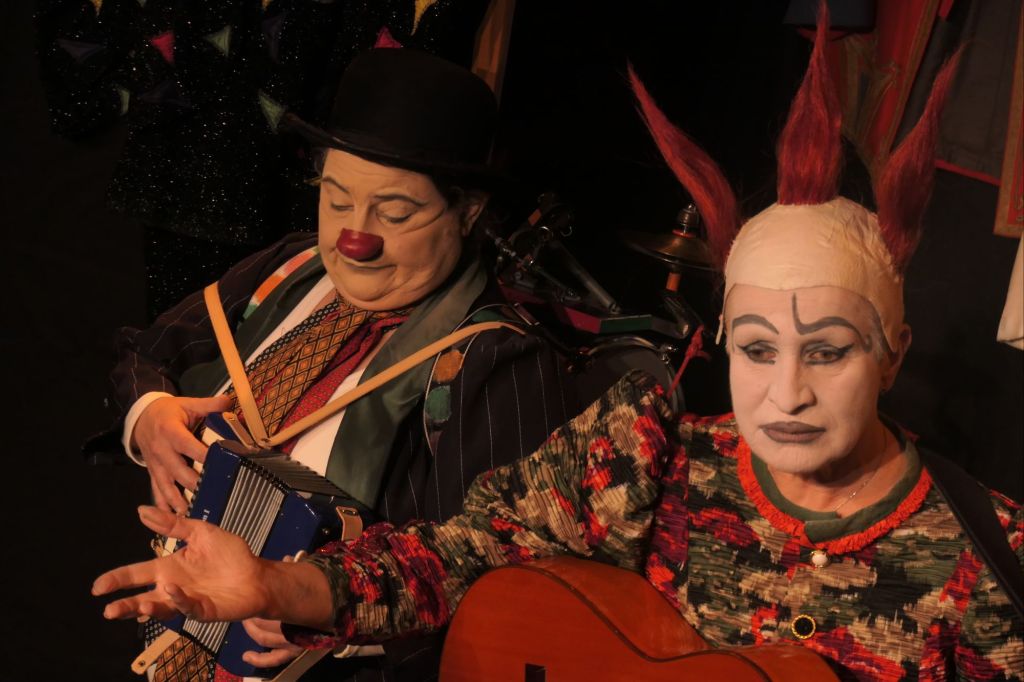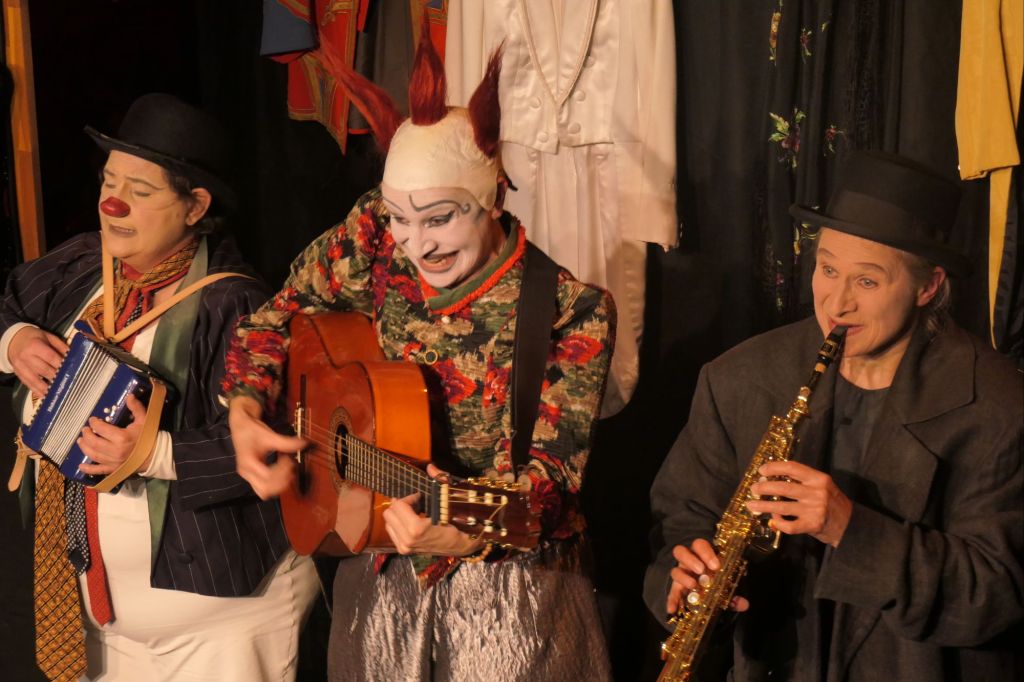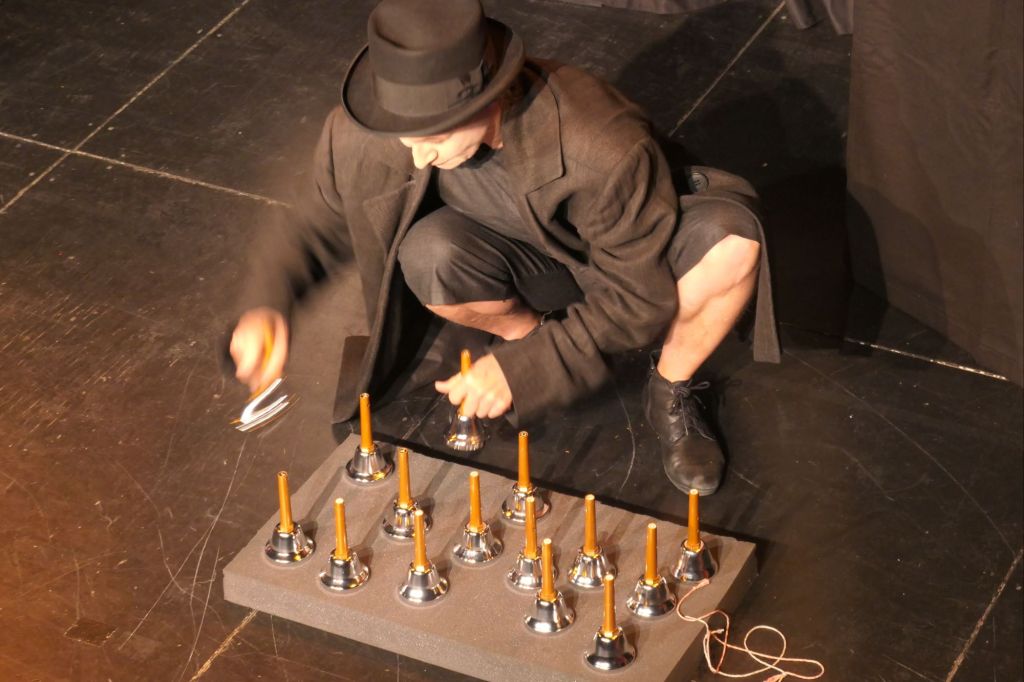 Die ersten zwei führten ein Programm auf mit Musik und Liedern, mit einer schönen Frau und mit einer starken Frau, als Vagabund mit einem Liegestuhl auf die Bühne stolperte. Langsam fügte er sich in die Truppe ein und spielte viele Instrumente, auch ein schwieriges Stück mit den Glocken.