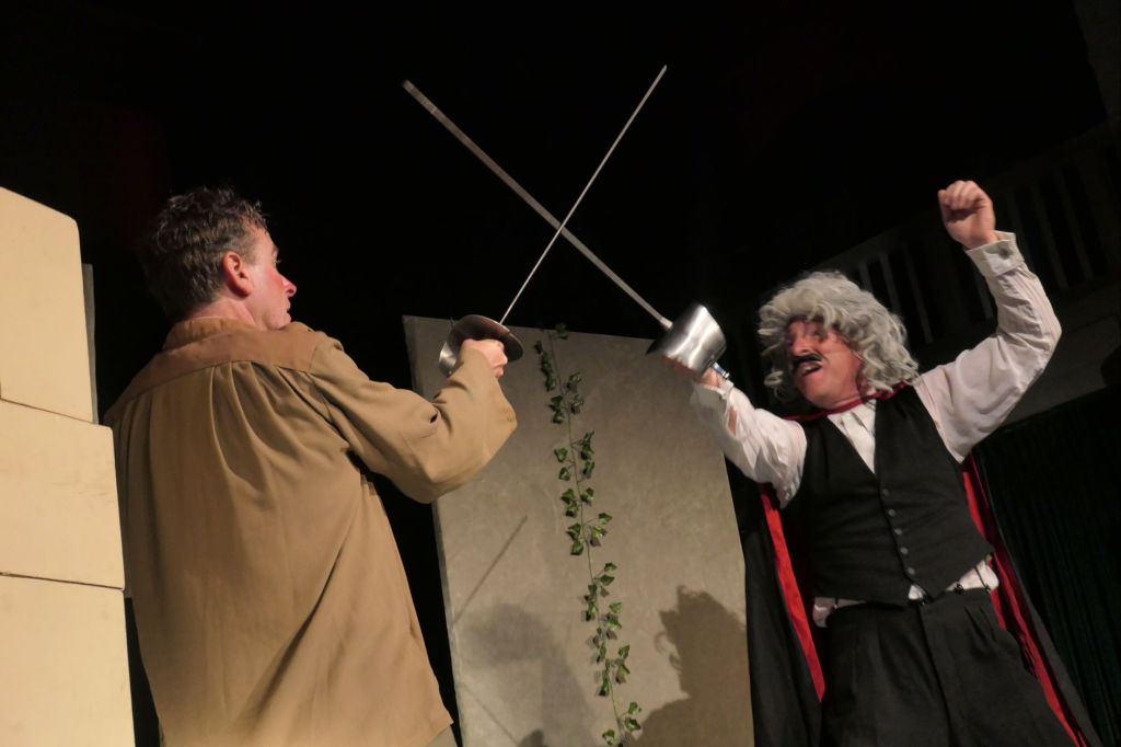 Immer wieder zeigten sie verblüffende Tricks, einfach so im nebenbei. Mehr sei dazu nicht verraten, damit es interessant bleibt, das Stück anschauen zu gehen. Ein Fechtkampf fand statt, eine Entfesselung und immer wieder gute Anspielungen mit Sprüchen auf heute.