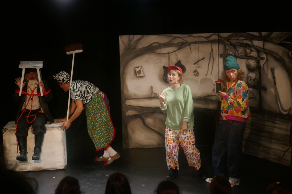 Die ganzen fantasievollen Ideen vom Schrumpfen oder Großwerden genial in Szene gesetzt, auch das ins Loch fallen. Der Nicht-Geburtstagsfeiernde, die Raupe und die Herzkönigin kamen farbenprächtig und witzig daher. Auch die Szenen mit der grinsenden Katze und dem Kaninchen waren wundervoll verspielt. Die Kinder folgten sehr aufmerksam der Geschichte und den Verwirrnissen. Einmal mehr, einfach grossartig.