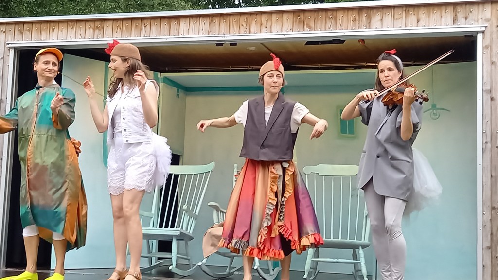 Dieses Theaterstück ist für Kinder ab 5 Jahren inszeniert und dieses Alter stimmt. Meine Enkel, 5 und 7 jährig waren begeistert und auch der 5jährige ist voll mitgegangen. Am Anfang trat ein Fuchs auf, als Erzähler. Dann kamen die Chefhühner zum Einsatz und schon bald ein Junghuhn ohne Namen. Da wurde gepickt und gehackt. Das Junghuhn musste sich an die Regeln halten, auch als das nächste Junghuhn im Hühnerhof aufkreuzte. Nach einigem Hickhack unter den Junghühnern, wurden sie Freundinnen. Sie wurden gemeinsam stark und entdeckten die Welt. Das ist eine Kurzversion der Geschichte. Diese wurde mit Choreographien, Musik und Gesang liebevoll umgesetzt. Die ganze Bühne, das Bühnenbild und die Kostüme sind einfach aber sehr effektiv gehalten. Nichts lenkt vom Wesentlichen ab. Diese Aufführung ist eine Uraufführung und es braucht Mut so ein Stück aufzuführen, aber Hut ab, es ist nicht nur gelungen, sondern wiederum sehr gut gelungen mit viel Feingefühl für die Details.