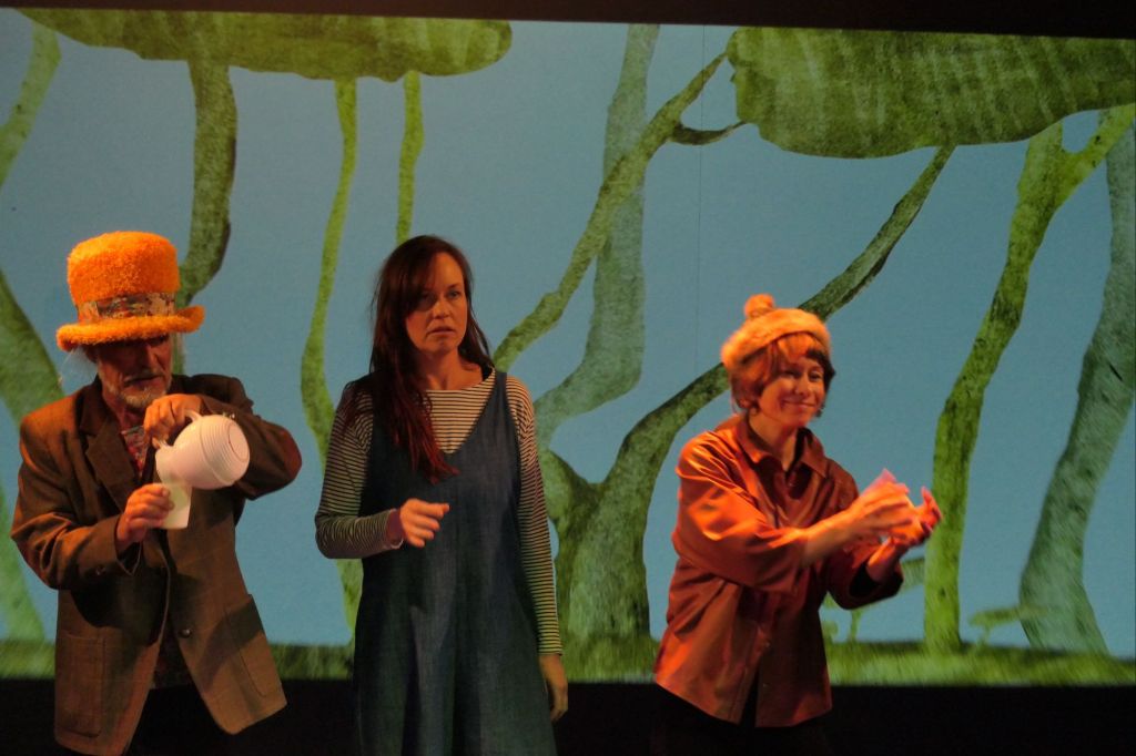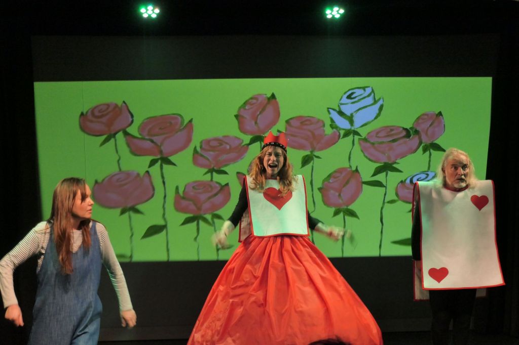Der Faden der Geschichte ist schnell erzählt. Alice schläft am Tag auf der Schaukel ein und hat einen seltsamen Traum. Sie rennt einem Kaninchen nach, schlüpft in den Bau und fällt in eine andere Welt. Dort wird sie klein und gross und ist nicht mehr sich selbst. Sie begegnet einer grinsenden Katze, dem Hutmacher, einer Raupe und der Herzkönigin. Alles läuft verkehrt und Alice wird es auch zu viel. Da hilft nur aufwachen. Der fantasievolle Stoff wurde in ein sprühendes Feuerwerk umgewandelt und umgesetzt. Gespielt wurde es von drei Personen, welche alle Rollen übernahmen und das noch grossartig.