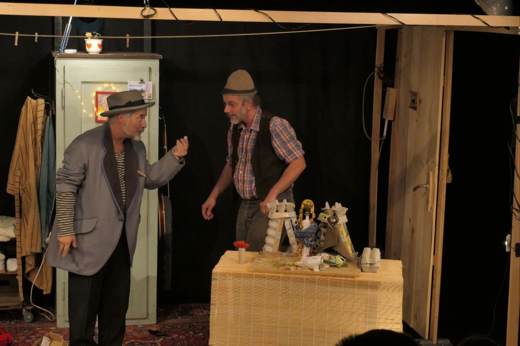 Wer kennt sie nicht aus längst vergangenen Zeiten, Franz und René, aus dem Fernsehen. Franz Hohler und René Quellet spielten dazumals die Szenen, so als Guetnachtgschichtli. Jetzt hat sich die Theater-Szene diesen Szenen angenommen und ein wundervolles Theater für Kinder ab ca. 4 Jahren und Erwachsene, welche Spass an Kindereien haben daraus gemacht. Die beiden Figuren möchten in die Ferien, haben nur noch 70 Rappen zusammen, so bleiben sie zuhause und erleben Ferien am Meer in ihrer Fantasie. Aus gesammeltem Schrott entstand ein Flugzeug, welches dann abstürzte, ein Liegestuhl bauten sie, sie gingen schwimmen, wurden von einer Qualle angegriffen, Franz liest ein Buch, die Mücken, durch das Publikum lautmalerisch dargestellt überfielen sie. So erlebten sie ein Abenteuer nach dem anderen.