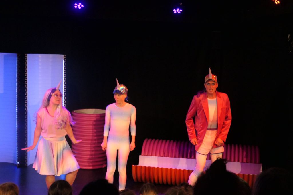 Das war die ausverkaufte Vorpremiere eines wundervollen Stückes für Kinder ab etwa 4 Jahren. Die Geschichte ist von Marc-Uwe Kling. Die Theater-Szene brachte die beiden Bilderbücher „Das NEINhorn“ und „Das NEINhorn und die SchLANGEWEILE“ auf die Bühne. Das kleine Einhorn mag die Zuckerwattenwelt ihrer Eltern nicht, sagt immer nein und wird zum NEINhorn.
