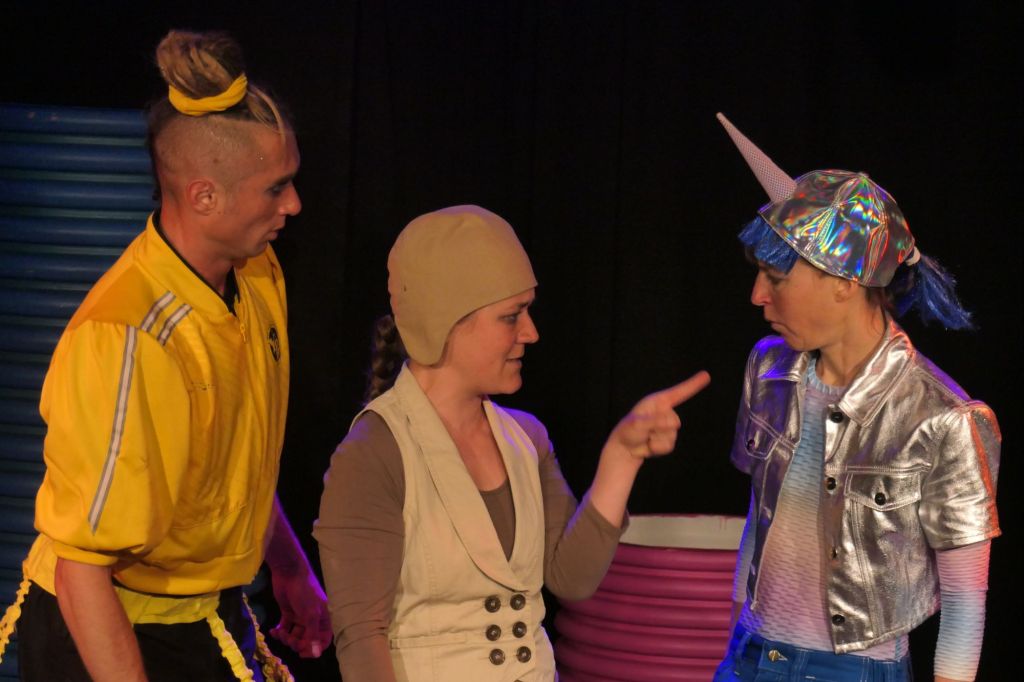 Diese Geschichten wurden zu dritt gespielt, also Rollenwechsel oder eine gleichzeitige Doppelrolle waren angesagt. Dies klappte vorzüglich und die Kinder wie auch die Erwachsenen konnten mühelos folgen. Das Theater war ausgezeichnet inszeniert, witzig und fantasievoll wie die Bücher. Die Auseinandersetzungen zwischen NEIN und DOCH, dazwischen WAS und NA UND, aber auch MEINETWEGEN, waren grossartig.