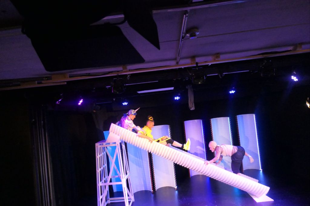 Die kleinen Punkte, über welche die drei immer wieder ins Streiten kamen und eine Kaskade von NEIN und DOCH hervorrief, waren aus dem Leben gegriffen. Eine Szene war, wer bekommt das rosarote Guetzli, was dann zum grösseren Guetzli und am Schluss zur grösseren Brosame führte. Das Bühnenbild war einfach, faszinierend und sehr ausgeklügelt. Es bestand aus halben, gerippten Kunststoffröhren, welche von Wiege zu Rollbahn, Bäumen bis zur Riesenrutsche dienten. Gespielt wurde grossartig, mit viel Tempo, immer verständlich. Das Publikum war während der ganzen etwa 45 Minuten mucksmäuschenstill. Ein grossartiges Theater für Klein und Gross. Die Theater-Szene spielt es noch bis im November, teils in der Theater-Szene und teils im Theaterwagen in Bern und Köniz. Auf der Homepage sind die Spieldaten ersichtlich.